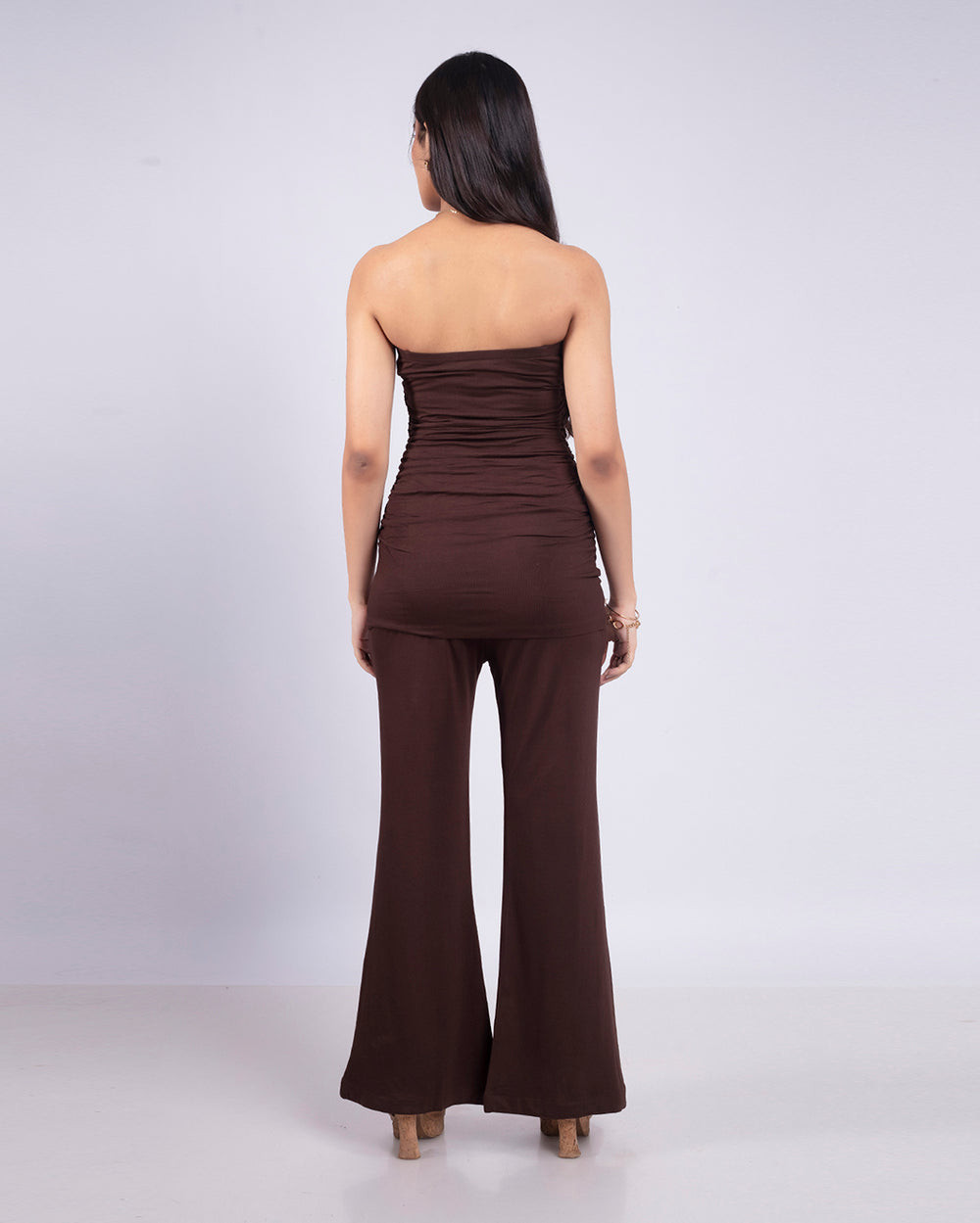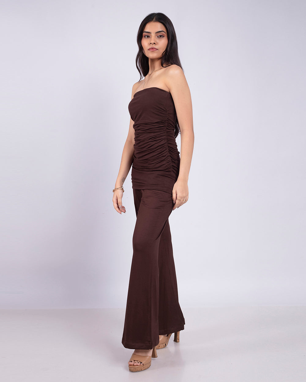 This chocolate brown strapless ruched jumpsuit is a stylish and sophisticated wardrobe essential. Designed with a flattering ruched bodice, it enhances your curves while providing a snug and comfortable fit. The strapless neckline adds a chic, elegant touch, making it perfect for evening outings, parties, or special occasions.